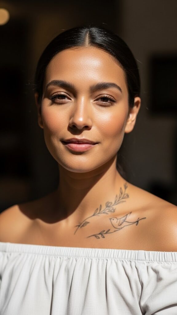 The first time I saw a tiny script tattoo along someone’s collarbone, I swear it rewired my brain. There’s something really gentle about this placement like jewelry that never comes off. It slips in and out of view depending on your outfits, and it always feels a little romantic without trying.