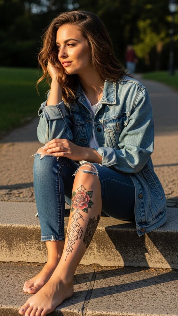 Calf tattoos have this grounded, steady energy. They show up when you walk, stretch, dance, or sprawl out on the couch, and somehow they always look good doing it. I love how they work with both cozy outfits and more styled looks without needing to be hidden or highlighted.