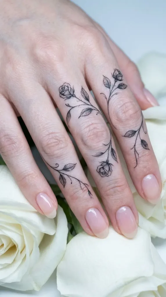 There is something quietly beautiful about a tattoo that feels like it grew there naturally. These fine line rose vine finger tattoos do exactly that. Each finger carries its own tiny bloom, with delicate leaves and curling stems that wind along the sides like a living garden. The linework is incredibly fine, almost like ink drawn with a single hair.