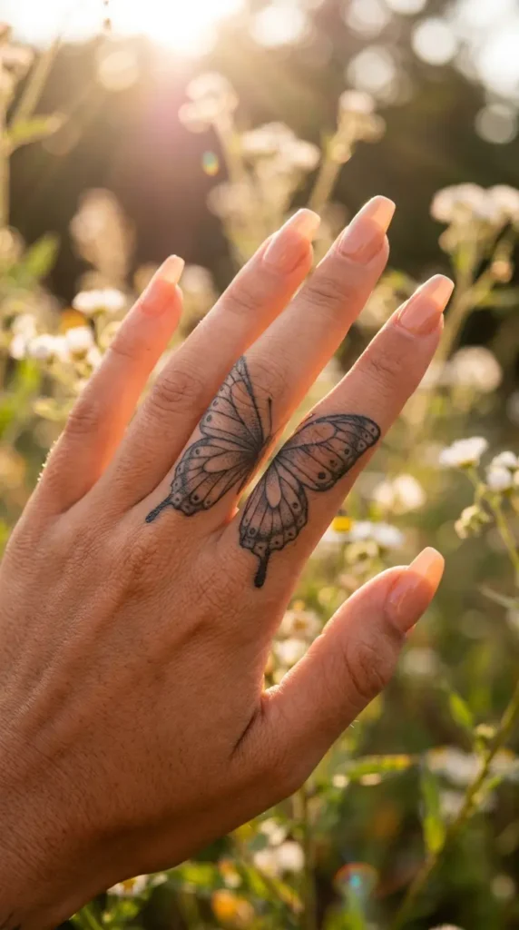 This one feels like summer captured in ink. A fine line butterfly spreads its wings across two fingers, creating a split design that only comes together when the fingers are pressed side by side. The concept alone is creative, but the execution makes it truly special.