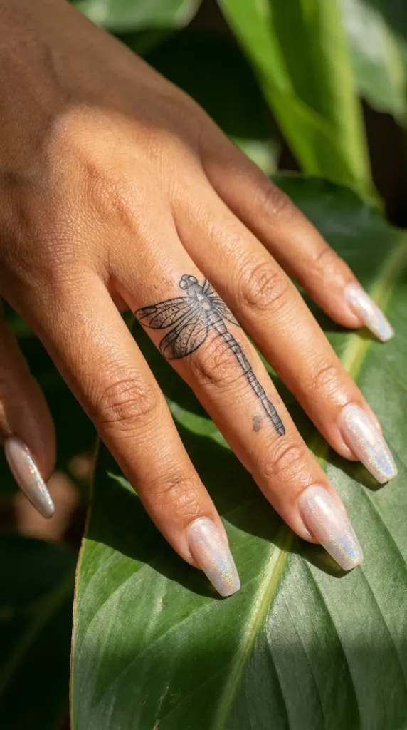 Some tattoos just stop you mid scroll. This dragonfly finger tattoo is one of them. Placed across the middle finger, the design stretches its wings wide, filling the space with quiet confidence. The detailing on the wings is surprisingly intricate for such a small canvas. Every vein, every line feels intentional.