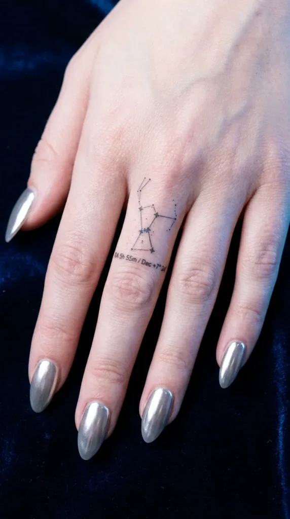 This is a tattoo for the person who has always felt a little more connected to the night sky than to the ground beneath them. A miniature Orion constellation sits on the index finger, mapped out with tiny dots and fine connecting lines that mirror an actual star chart. Below the design, celestial coordinates are inscribed in the smallest, cleanest lettering. That detail alone sets this apart.