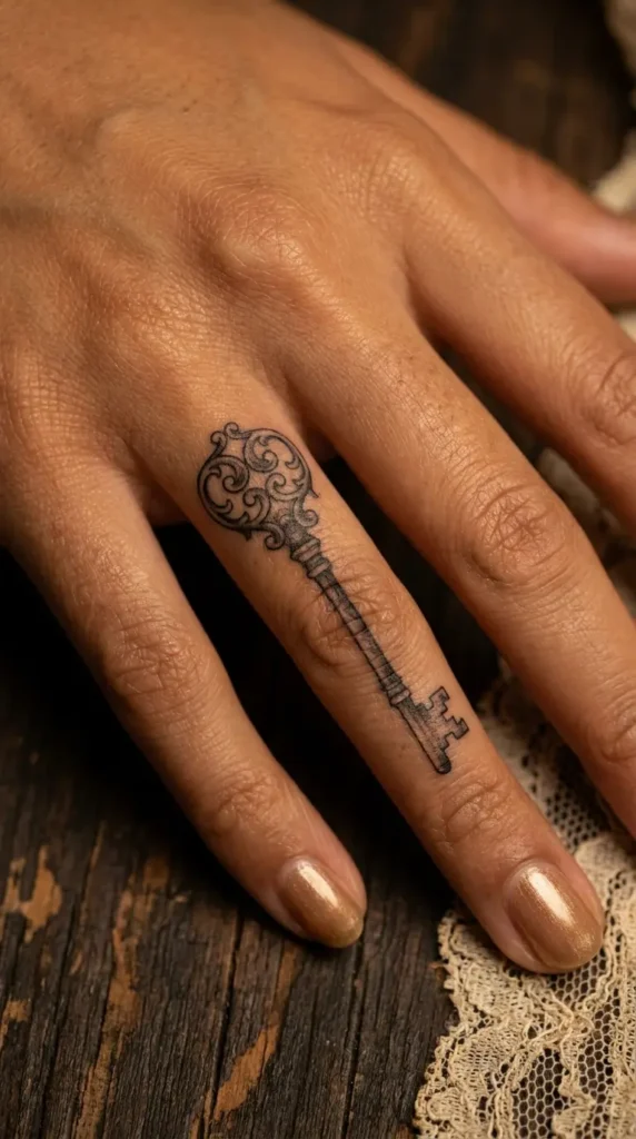 Key tattoos speak to themes of access, freedom, and unlocking something within yourself. But beyond the symbolism, this design just looks stunning. The ornate top draws the eye immediately, while the slim shaft follows the natural line of the finger with surprising elegance.