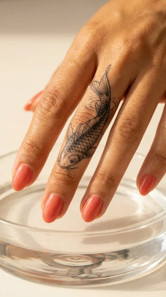 Not many finger tattoos carry this much detail in such a small space. This koi fish design runs the full length of the middle finger, from tip to base, with the fish swimming downward in one graceful, continuous motion. The scale work is remarkably precise, and the flowing fins give the whole piece a sense of movement that feels almost animated.