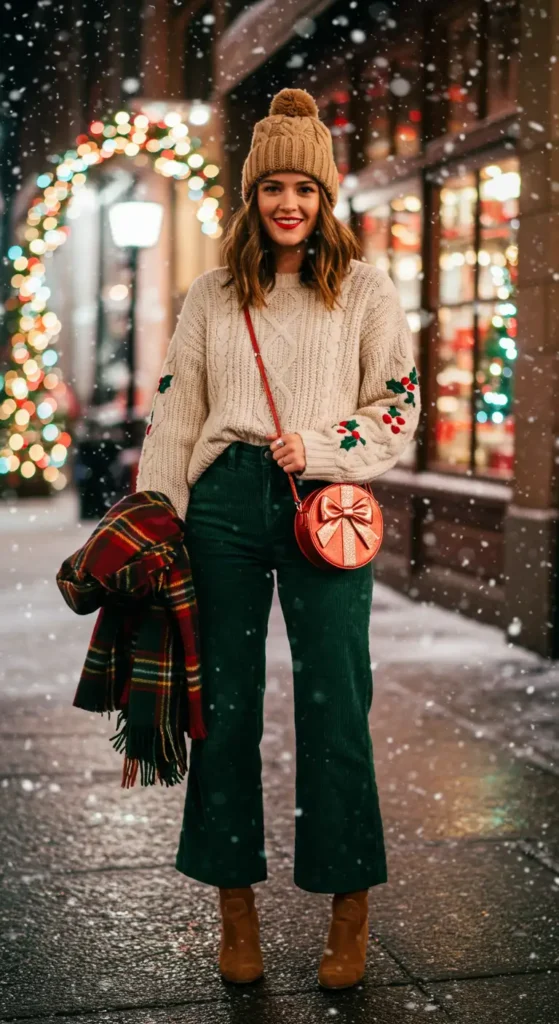 Forest green corduroy pants create a rich foundation, while the playful gift box purse adds whimsical holiday charm. A chunky knit beanie keeps things cozy, and the classic plaid scarf brings traditional Christmas warmth.