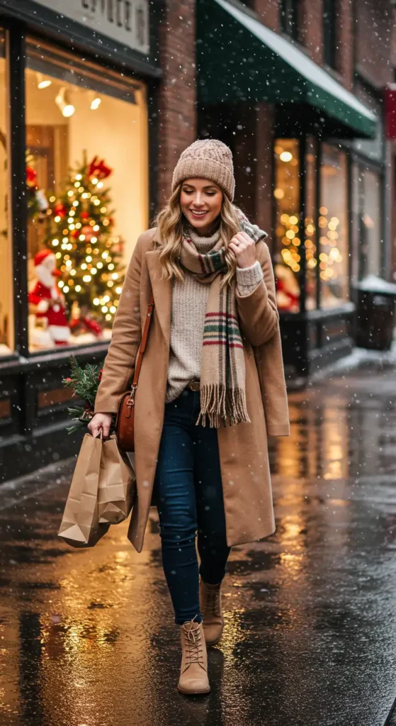 The chunky oatmeal turtleneck sweater pairs beautifully with dark wash skinny jeans, creating a comfortable foundation for long shopping days. A classic camel wool coat provides sophisticated warmth, while the matching plaid scarf adds textural interest and cozy appeal.