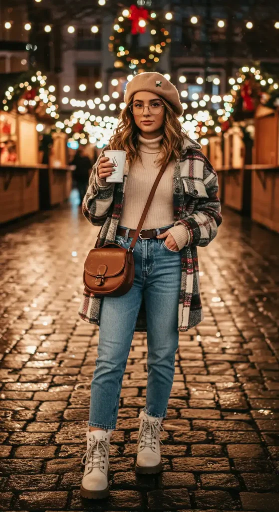 The oversized plaid coat in festive red and green hues brings holiday spirit while providing warmth during chilly winter outings. A tan beret adds Parisian flair, complemented by wire-rimmed glasses and a crossbody leather bag.