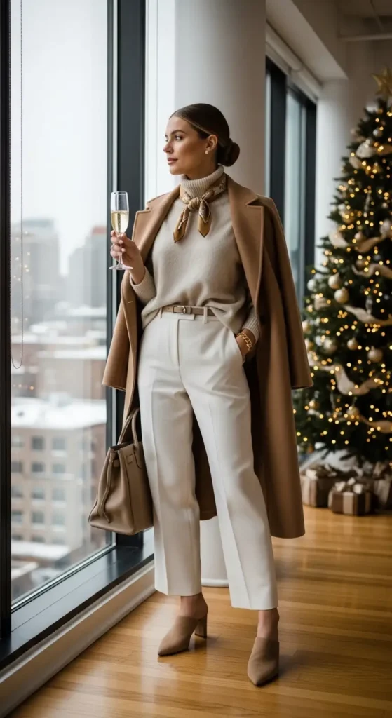Monochromatic elegance defines this approach to casual Christmas outfits, showcasing how neutral tones can feel seasonally appropriate and utterly chic.