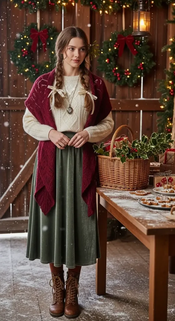 This enchanting ensemble captures the essence of casual Christmas outfits with vintage-inspired charm and countryside appeal. A cream cable-knit sweater provides cozy warmth beneath a rich burgundy knitted vest that adds festive color depth.
