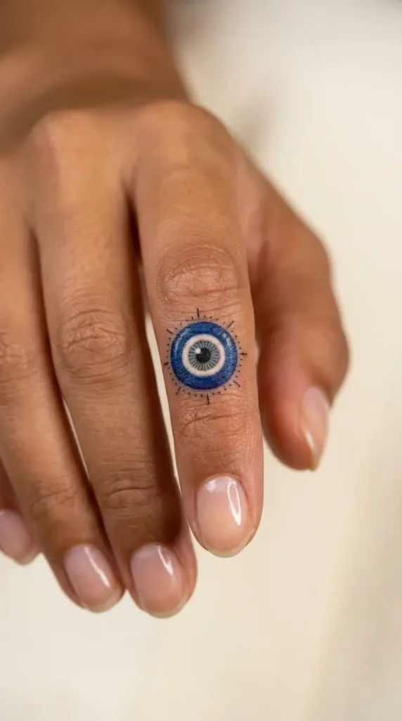 Bold color on a finger tattoo is rare. This one pulls it off beautifully. A vivid evil eye sits front and center on the index finger, rendered in deep cobalt blue with a crisp white ring and a dark, almost lifelike pupil at its core. Tiny radiating lines surround the design like rays of light, giving it an almost sacred, talisman quality.