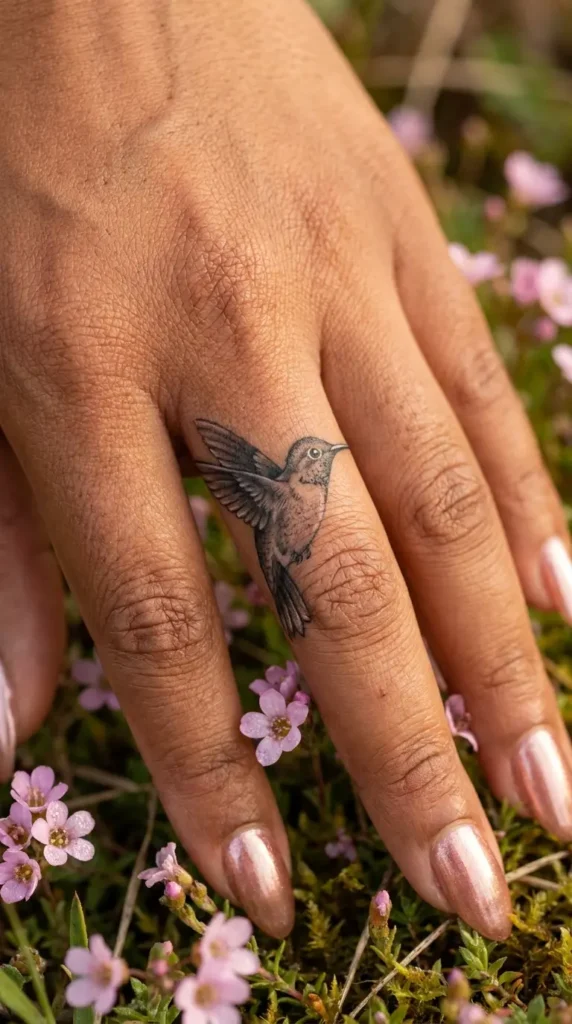 It is hard to believe how much life fits into this tiny design. A hummingbird mid hover, wings spread wide, sits across the middle finger with a level of realism that stops you in your tracks. The feather texture, the tiny bright eye, the slight curve of the body in flight . every detail is rendered with incredible care and precision for such a small canvas.