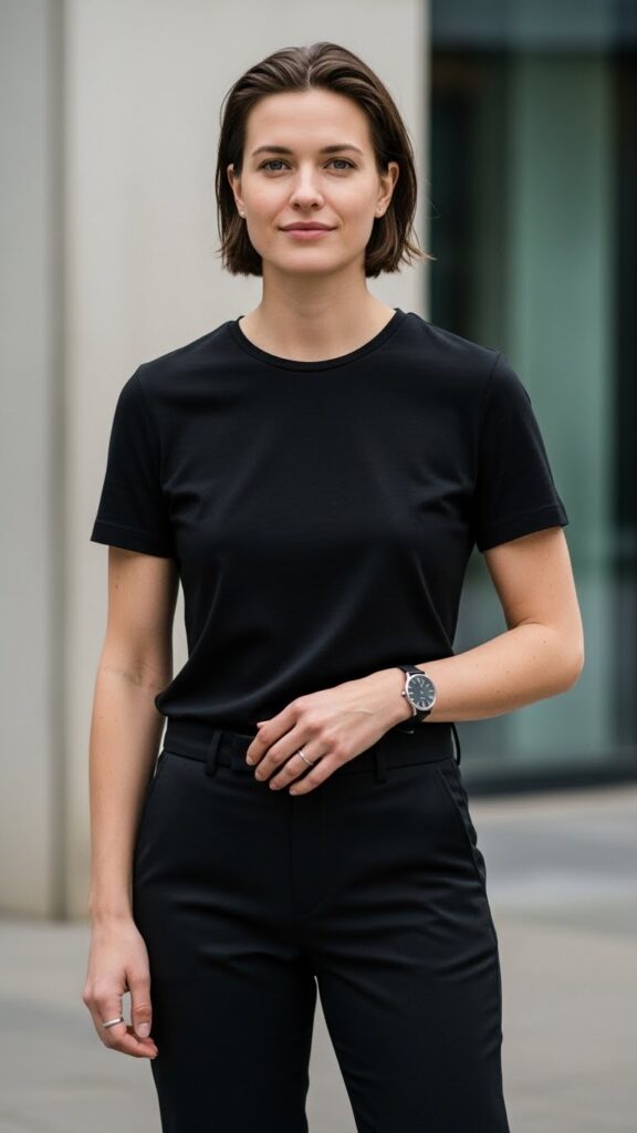 There’s something powerful about an all-black outfit when you’re short on time. A simple black tee and black pants somehow feels confident, even when you’re exhausted. I throw this on when I want to feel grounded and not think about colors at all.