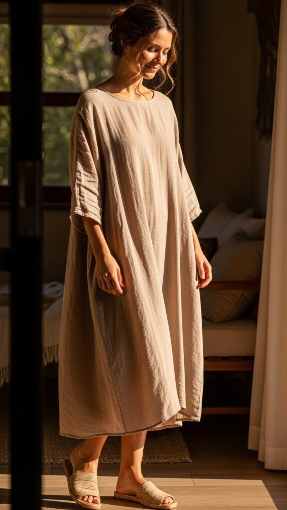 This is my quiet favorite. A soft, easy dress with slides feels gentle and stress-free, especially on busy days when you’re emotionally tired too. I love this for days when I want to feel calm, comfortable, and a little put together without trying.