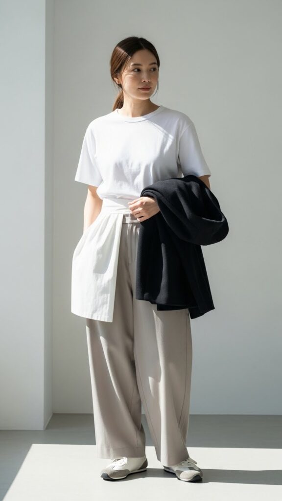 This combo always surprises me with how good it looks. A clean white tee tucked into wide-leg pants feels fresh and effortless, even when you’re running on low energy. It’s one of those easy outfits for busy days that somehow always gets compliments.