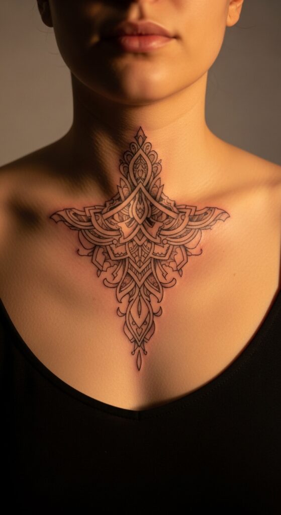 Centered sternum tattoos create stunning symmetry that works universally. This placement has grown increasingly popular for its aesthetic appeal and the meaningful symbolism of positioning art over the heart. Designs here typically flow vertically down the center of the chest, though some people choose horizontal or radiating patterns.